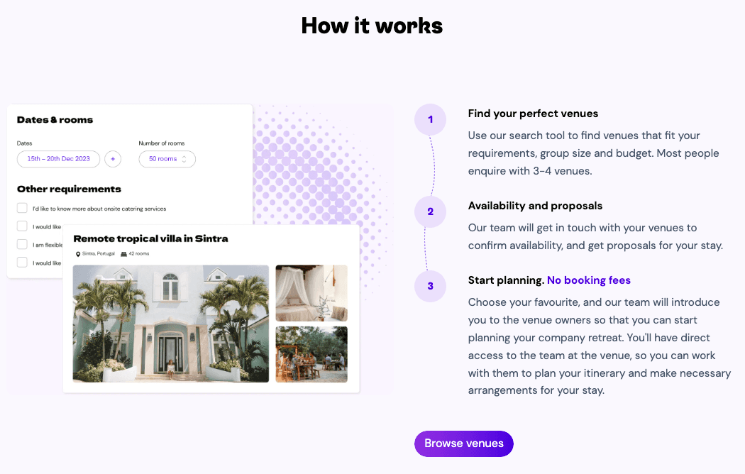 Basejam makes finding and booking a venue for your team retreat a breeze. Browse our curated and searchable database to find the ideal offsite venue. Then send venue enquiries in a couple of clicks. Alternatively, if you need help with full-service retreat planning, sign up for free.