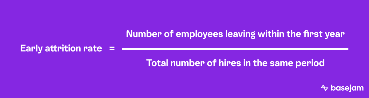 If an organisation hires 1000 employees in a year, but 100 of them leave within their first year, you calculate the early attrition rate by dividing the number of departures by the number of people who were hired in that period. Multiply this by 100 to get the percentage.